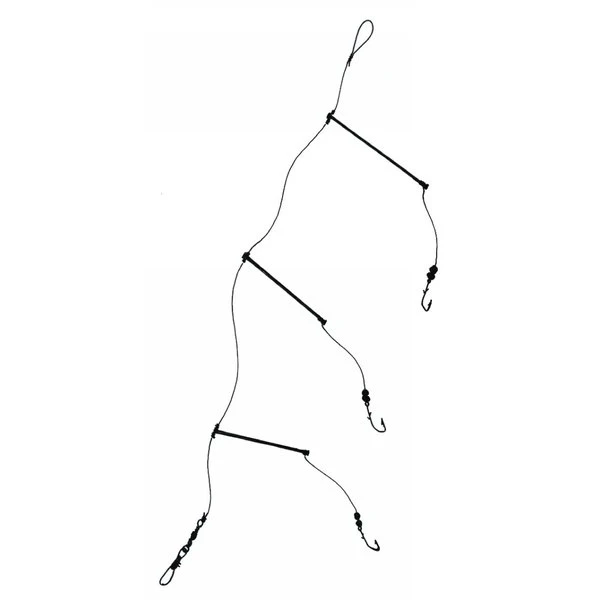 Deep blue platvisonderlijn met 3 bezemafhouders, met een lengte van 15 cm, die aan de hoofdlijn geknoopt wordt. Beschikbaar in verschillende haakmaten, met een totale lengte van 135 cm.