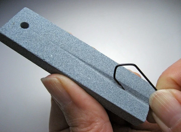 Haken kunnen botter worden door het stoten en schrapen langs stenen en/of andere harde obstakels in het water. Ook na de dril van een vis kan de haakpunt een stuk botter zijn geworden. Het is altijd verstandig om de haakpunt te controleren en deze punt opnieuw bij te slijpen. Deze hakenslijper is voor dat doel ontwikkeld. Slijp de haak punt door de V-groef een paar keer heen en weer totdat de optimale scherpte bereikt is!